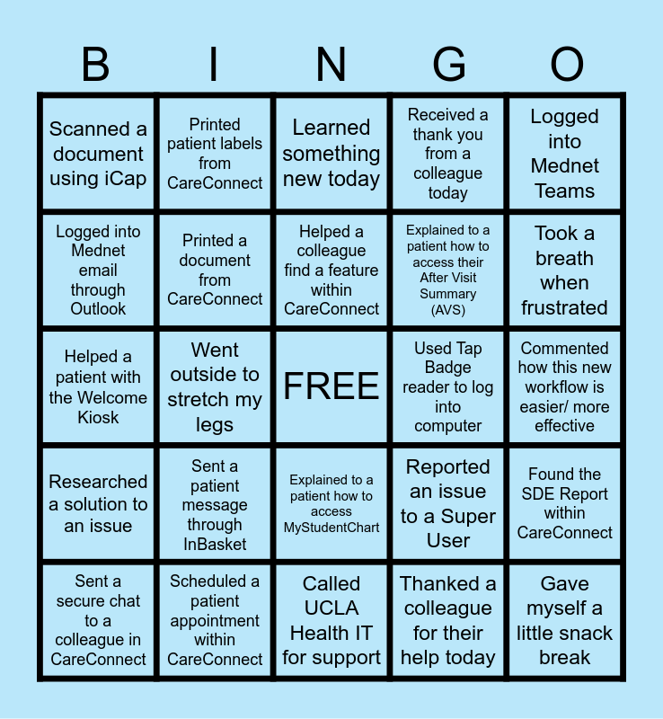 This bingo card has a free space and 24 words: Sent a patient message through InBasket, Scheduled a patient appointment within CareConnect, Helped a colleague find a feature within CareConnect, Sent a secure chat to a colleague in CareConnect, Logged into Mednet Teams, Scanned a document using iCap, Logged into Mednet email through Outlook, Printed patient labels from CareConnect, Used Tap Badge reader to log into computer, Explained to a patient how to access MyStudentChart, Explained to a patient how to access their After Visit Summary (AVS), Helped a patient with the Welcome Kiosk, Reported an issue to a Super User, Found the SDE Report within CareConnect, Printed a document from CareConnect, Thanked a colleague for their help today, Commented how this new workflow is easier/ more effective, Learned something new today, Took a breath when frustrated, Went outside to stretch my legs, Gave myself a little snack break, Researched a solution to an issue, Received a thank you from a colleague today and Called UCLA Health IT for support.