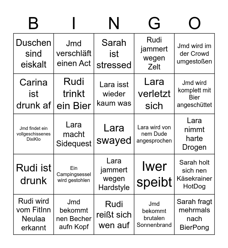 This bingo card has a free space and 29 words: Rudi wird vom FitInn Neulaa erkannt, Jmd gib über 150 Euro aus, Lara macht Sidequest, Ein Streit, Duschen sind eiskalt, Sarah ist stressed, Rudi trinkt ein Bier, Ein Campingsessel wird gestohlen, Lara wird von nem Dude angesprochen, Jmd bekommt nen Becher aufn Kopf, Lara nimmt harte Drogen, Sarah fragt mehrmals nach BierPong, Rudi reißt sich wen auf, Jmd bekommt brutalen Sonnenbrand, Jmd wird komplett mit Bier angeschüttet, Carina wird von nem Dude angesprochen, Lara jammert wegen Hardstyle, Rudi ist drunk, Jmd wird im der Crowd umgestoßen, Jmd findet ein vollgeschissenes DixiKlo, Iwer speibt, Rudi wird von nem Dude angesprochen, Lara verletzt sich, Carina ist drunk af, Rudi jammert wegen Zelt, Jmd verschläft einen Act, Sarah holt sich nen Käsekrainer HotDog, Lara isst wieder kaum was and Nippel Blitzer.