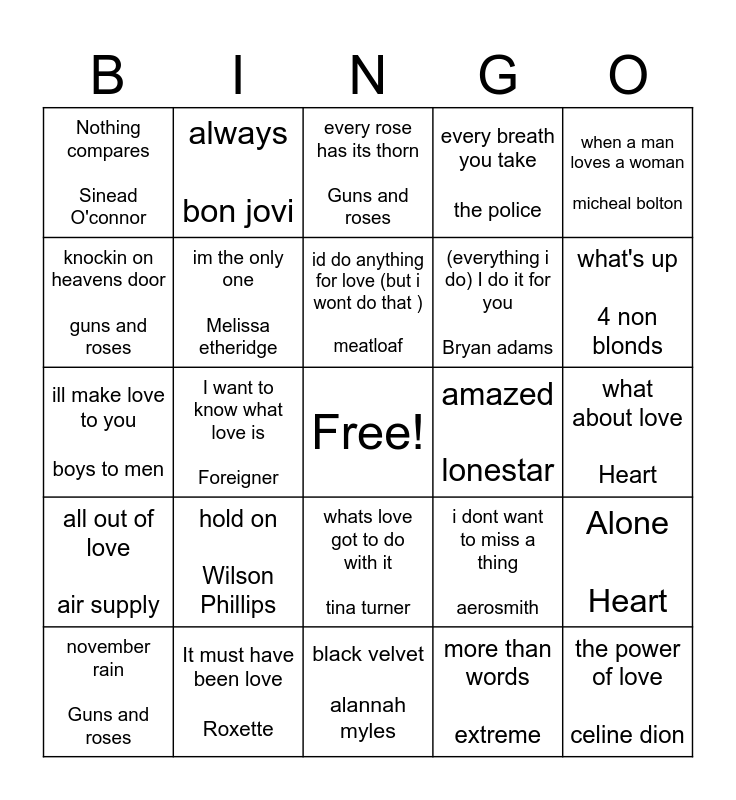 This bingo card has a free space and 29 words: I have nothing Whitney houston, It must have been love Roxette, every rose has its thorn Guns and roses, to be with you Mr big, when a man loves a woman micheal bolton, Nothing compares Sinead O'connor, im the only one Melissa etheridge, id do anything for love (but i wont do that ) meatloaf, amazed lonestar, Alone Heart, november rain Guns and roses, I want to know what love is Foreigner, more than words extreme, the power of love celine dion, ill make love to you boys to men, total eclipse of the heart bonnie tyler, black velvet alannah myles, i dont want to miss a thing aerosmith, what's up 4 non blonds, all out of love air supply, hold on Wilson Phillips, its all coming back to me now celine dion, (everything i do) I do it for you Bryan adams, what about love Heart, knockin on heavens door guns and roses, always bon jovi, whats love got to do with it tina turner, every breath you take the police and every rose has its thorn Poison.