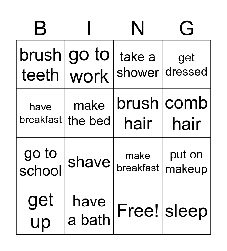 This bingo card has 17 words: Free!, get up, take a shower, brush teeth, shave, get dressed, put on makeup, brush hair, comb hair, make the bed, have a bath, make breakfast, have breakfast, go to work, go to school, go to bed and sleep.