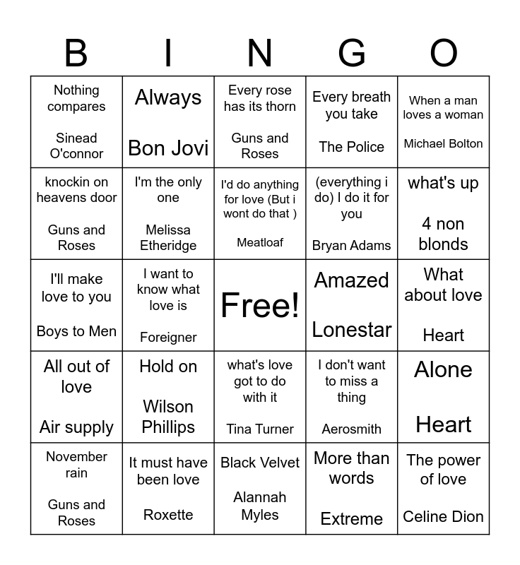 This bingo card has a free space and 29 words: I have nothing Whitney Houston, It must have been love Roxette, Every rose has its thorn Guns and Roses, To be with you Mr big, When a man loves a woman Michael Bolton, Nothing compares Sinead O'connor, I'm the only one Melissa Etheridge, I'd do anything for love (But i wont do that ) Meatloaf, Amazed Lonestar, Alone Heart, November rain Guns and Roses, I want to know what love is Foreigner, More than words Extreme, The power of love Celine Dion, I'll make love to you Boys to Men, Total eclipse of the heart Bonnie Tyler, Black Velvet Alannah Myles, I don't want to miss a thing Aerosmith, what's up 4 non blonds, All out of love Air supply, Hold on Wilson Phillips, Its all coming back to me now Celine Dion, (everything i do) I do it for you Bryan Adams, What about love Heart, knockin on heavens door Guns and Roses, Always Bon Jovi, what's love got to do with it Tina Turner, Every breath you take The Police and Every rose has its thorn Poison.