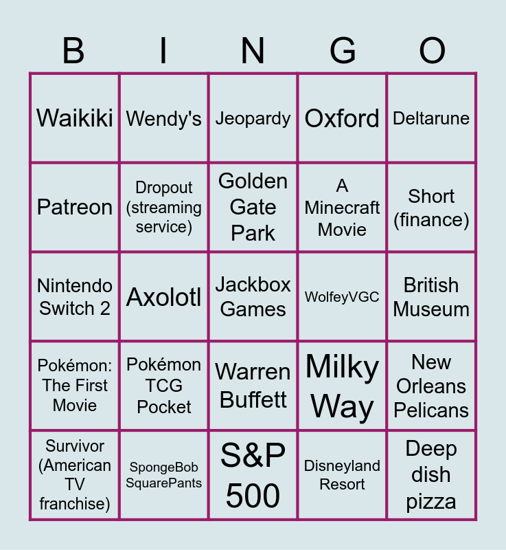 This bingo card has 25 words: Pokémon TCG Pocket, S&P 500, Golden Gate Park, Survivor (American TV franchise), Deltarune, Waikiki, Patreon, Wendy's, WolfeyVGC, Warren Buffett, A Minecraft Movie, Nintendo Switch 2, Milky Way, New Orleans Pelicans, Dropout (streaming service), Deep dish pizza, British Museum, Jeopardy, Short (finance), Axolotl, Jackbox Games, SpongeBob SquarePants, Pokémon: The First Movie, Oxford and Disneyland Resort.