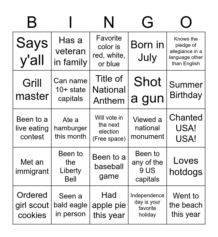 This bingo card has a free space and 29 words: Ordered girl scout cookies, Been to 4+ states, Ate a hamburger this month, Read the Declaration of Independence, Says y'all, Favorite color is red, white, or blue, Can name 10+ state capitals, Been to the Liberty Bell, Viewed a national monument, Seen a bald eagle in person, Chanted USA! USA!, Went to the beach this year, Had apple pie this year, Independence day is your favorite holiday, Summer Birthday, Shot fireworks, Been to a baseball game, Met an immigrant, Knows the pledge of allegiance in a language other than English, Been to a live eating contest, Been to any of the 9 US capitals, Sang a patriotic song, Shot a gun, Grill master, Born in July, Has a veteran in family, Loves hotdogs, Title of National Anthem and # of stars and stripes on US flag.