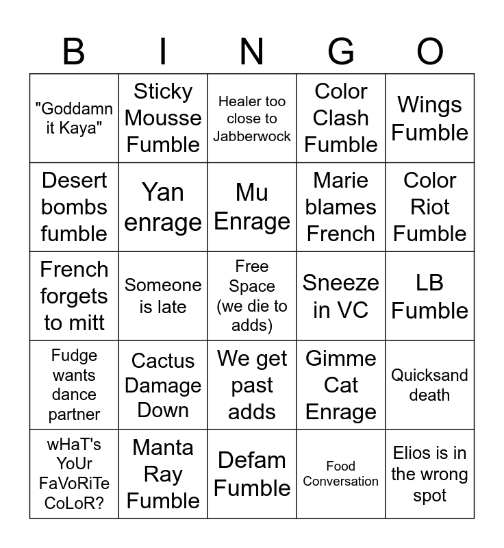 This bingo card has a free space and 25 words: wHaT's YoUr FaVoRiTe CoLoR?, Cactus Damage Down, Mu Enrage, Food Conversation, Color Riot Fumble, "Goddamn it Kaya", Sticky Mousse Fumble, Healer too close to Jabberwock, Marie blames French, Quicksand death, French forgets to mitt, Yan enrage, Gimme Cat Enrage, Elios is in the wrong spot, Desert bombs fumble, Manta Ray Fumble, Defam Fumble, Color Clash Fumble, LB Fumble, Fudge wants dance partner, Someone is late, We get past adds, Sneeze in VC, Wings Fumble and Gimme Cat Enrage.