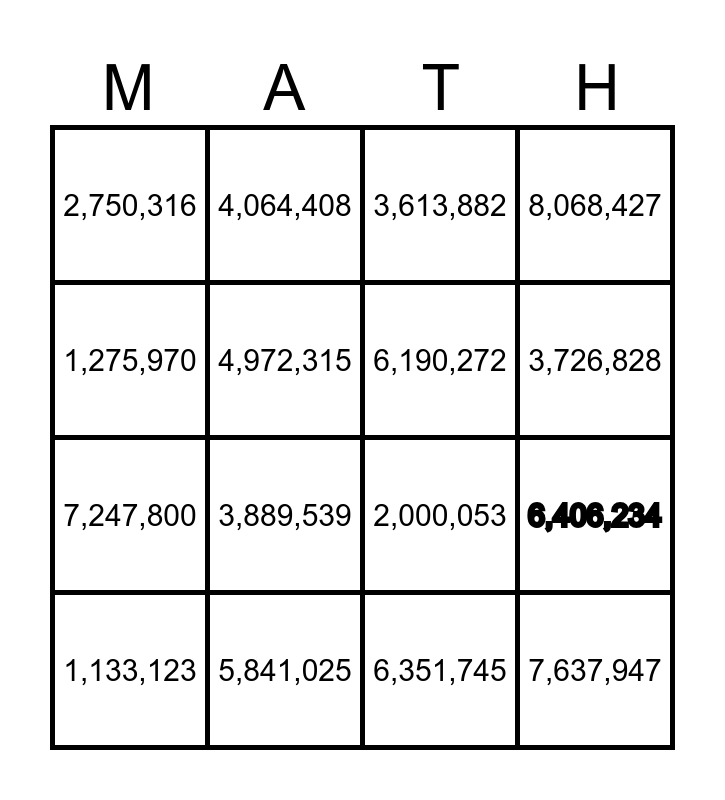 This bingo card has 20 words: 6,406,234, 2,522,697, 3,613,882, 1,394,701, 1,133,123, 1,275,970, 5,841,025, 2,750,316, 7,247,800, 4,064,408, 3,889,539, 2,000,053, 4,972,315, 7,637,947, 6,190,272, 5,993,154, 3,726,828, 8,068,427, 6,351,745 and 5,480,603.
