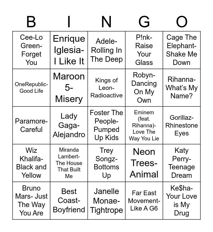 This bingo card has 26 words: Trey Songz- Bottoms Up, Far East Movement- Like A G6, Kings of Leon- Radioactive, Best Coast- Boyfriend, Cage The Elephant- Shake Me Down, Cee-Lo Green- Forget You, OneRepublic- Good Life, Enrique Iglesia- I Like It, Gorillaz- Rhinestone Eyes, Neon Trees- Animal, Robyn- Dancing On My Own, Paramore- Careful, Katy Perry- Teenage Dream, Bruno Mars- Just The Way You Are, Lady Gaga-Alejandro, John Mayer- Half of My Heart, P!nk- Raise Your Glass, Wiz Khalifa- Black and Yellow, Adele- Rolling In The Deep, Foster The People- Pumped Up Kids, Rihanna- What’s My Name?, Janelle Monae- Tightrope, Eminem (feat. Rihanna)- Love The Way You Lie, Miranda Lambert- The House That Built Me, Maroon 5- Misery and Ke$ha- Your Love is My Drug.
