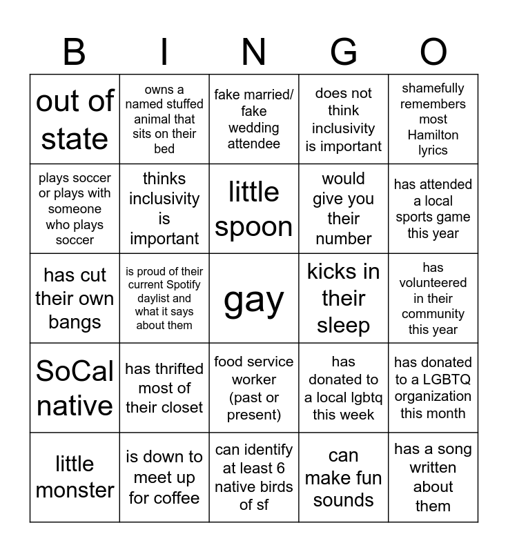 This bingo card has a free space and 47 words: has written a song, has a song written about them, made something with their hands this week, can identify at least 6 native birds of sf, has thrifted most of their closet, owns a Subaru, owns a named stuffed animal that sits on their bed, plays rugby or plays with someone who plays rugby, plays soccer or plays with someone who plays soccer, has played drunk sports, thinks inclusivity is important, does not think inclusivity is important, has donated to a LGBTQ organization this month, has donated to a local lgbtq this week, has kissed someone at this party tonight, big spoon, little spoon, kicks in their sleep, proudly reads fanfiction, shamefully remembers most Hamilton lyrics, is proud of their current Spotify daylist and what it says about them, can make fun sounds, out of state, would give you their number, owns multiple vehicles, has attended a local sports game this year, little monster, dyed hair, food service worker (past or present), SoCal native, literal tree hugger, owns a weapon, Legolas inclined, would win the hunger games, by hiding, contributed to this bingo sheet, is down to meet up for coffee, has volunteered in their community this year, made a new friend this week, reads more nonfiction then fiction, listens to more than one podcast a week, found jewelry on the street/wears it, fake married/ fake wedding attendee, has cut their own bangs, played mermaids, played fairies, has made pottery and ally.