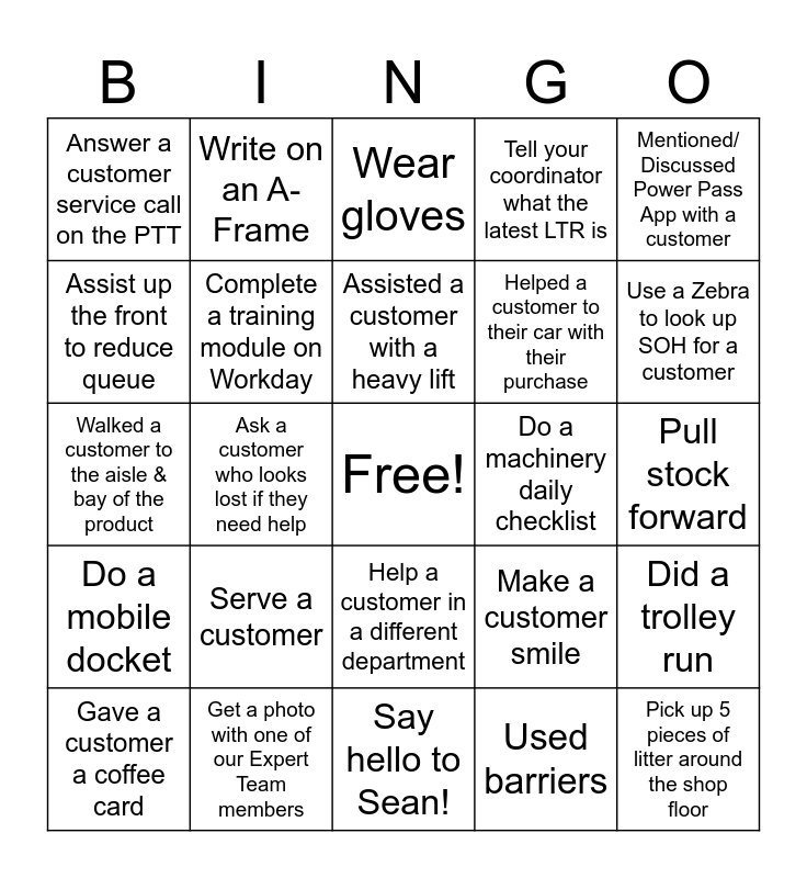 This bingo card has a free space and 24 words: Serve a customer, Get a photo with one of our Expert Team members, Assisted a customer with a heavy lift, Gave a customer a coffee card, Mentioned/ Discussed Power Pass App with a customer, Answer a customer service call on the PTT, Assist up the front to reduce queue, Write on an A-Frame, Do a machinery daily checklist, Help a customer in a different department, Helped a customer to their car with their purchase, Walked a customer to the aisle & bay of the product, Make a customer smile, Did a trolley run, Complete a training module on Workday, Used barriers, Pull stock forward, Wear gloves, Use a Zebra to look up SOH for a customer, Ask a customer who looks lost if they need help, Pick up 5 pieces of litter around the shop floor, Do a mobile docket, Tell your coordinator what the latest LTR is and Say hello to Sean!.