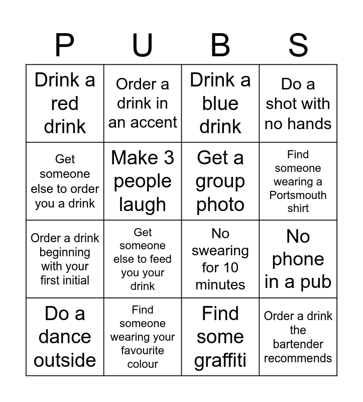 This bingo card has 16 words: Do a dance outside, Find someone wearing your favourite colour, Drink a blue drink, Do a shot with no hands, Get someone else to order you a drink, Order a drink in an accent, No swearing for 10 minutes, No phone in a pub, Drink a red drink, Make 3 people laugh, Find some graffiti, Find someone wearing a Portsmouth shirt, Order a drink beginning with your first initial, Get someone else to feed you your drink, Get a group photo and Order a drink the bartender recommends.