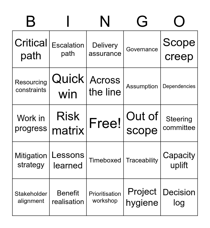 This bingo card has a free space and 37 words: MVP, Agile mindset, Backlog grooming, Quick win, Capacity uplift, Lessons learned, Across the line, Parking lot, Scope creep, Change request, Risk matrix, Governance, Decision log, Steering committee, Resourcing constraints, Mitigation strategy, Capability uplift, Delivery assurance, Timeboxed, Out of scope, Critical path, Dependencies, Stakeholder alignment, Prioritisation workshop, Retrospective, Project hygiene, Escalation path, Handover, Business readiness, Go live, Capacity planning, Benefit realisation, Work in progress, End to end visibility, Traceability, Assumption and Compliance.