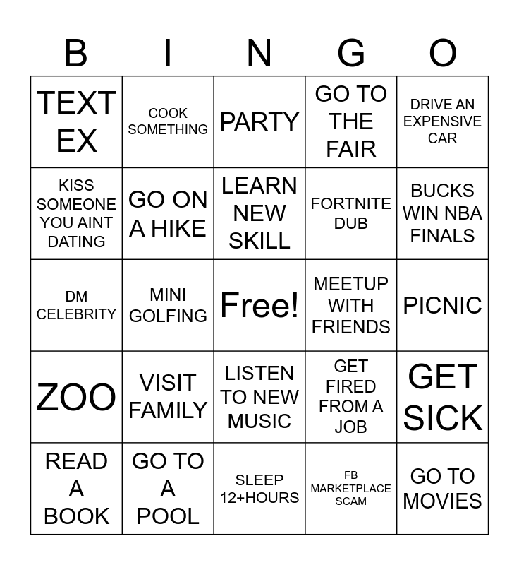 This bingo card has a free space and 24 words: VISIT FAMILY, GO TO A POOL, LEARN NEW SKILL, READ A BOOK, DRIVE AN EXPENSIVE CAR, TEXT EX, KISS SOMEONE YOU AINT DATING, COOK SOMETHING, MEETUP WITH FRIENDS, LISTEN TO NEW MUSIC, FORTNITE DUB, DM CELEBRITY, GET FIRED FROM A JOB, GET SICK, GO ON A HIKE, FB MARKETPLACE SCAM, PICNIC, PARTY, BUCKS WIN NBA FINALS, MINI GOLFING, GO TO MOVIES, ZOO, GO TO THE FAIR and SLEEP 12+HOURS.