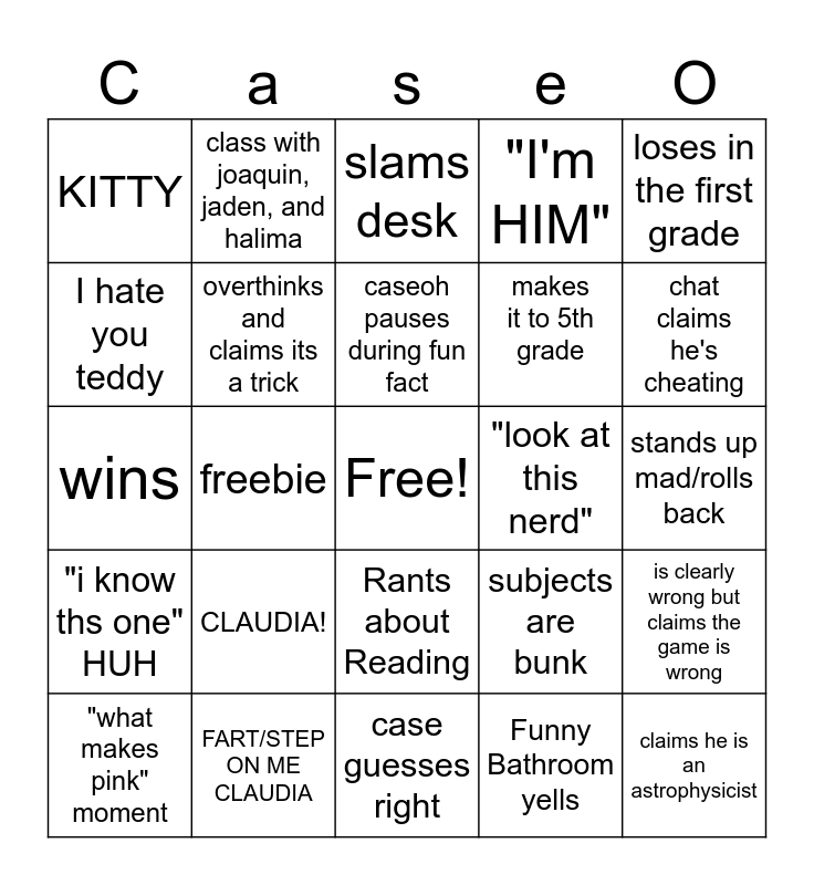 This bingo card has a free space and 24 words: CLAUDIA!, FART/STEP ON ME CLAUDIA, caseoh pauses during fun fact, "what makes pink" moment, loses in the first grade, KITTY, I hate you teddy, class with joaquin, jaden, and halima, "look at this nerd", Rants about Reading, makes it to 5th grade, wins, subjects are bunk, is clearly wrong but claims the game is wrong, overthinks and claims its a trick, Funny Bathroom yells, stands up mad/rolls back, slams desk, chat claims he's cheating, freebie, claims he is an astrophysicist, "i know ths one" HUH, "I'm HIM" and case guesses right.