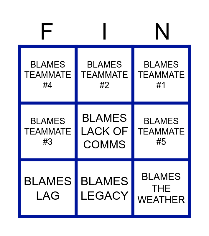 This bingo card has 9 words: BLAMES LAG, BLAMES TEAMMATE #1, BLAMES TEAMMATE #2, BLAMES TEAMMATE #3, BLAMES TEAMMATE #4, BLAMES TEAMMATE #5, BLAMES LACK OF COMMS, BLAMES THE WEATHER and BLAMES LEGACY.