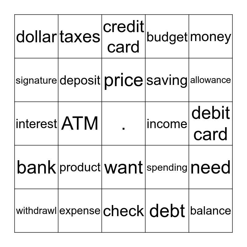 This bingo card has a free space and 24 words: product, expense, price, withdrawl, money, dollar, signature, taxes, income, want, saving, interest, spending, need, deposit, debt, debit card, credit card, allowance, ATM, balance, bank, budget and check.