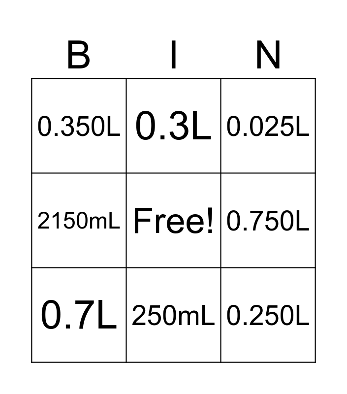 This bingo card has a free space and 19 words: 0.005L, 0.010L, 0.025L, 0.150L, 0.200L, 0.250L, 0.300L, 0.350L, 0.3L, 0.4L, 0.500L, 0.750L, 0.7L, 1.3L, 1L, 2.15L, 2150mL, 250mL and 750mL.