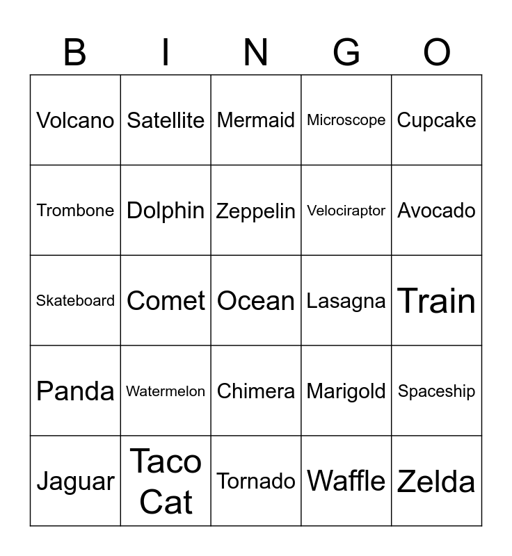 This bingo card has a free space and 24 words: Watermelon, Taco Cat, Zeppelin, Jaguar, Cupcake, Volcano, Trombone, Satellite, Lasagna, Chimera, Velociraptor, Skateboard, Marigold, Spaceship, Dolphin, Waffle, Train, Mermaid, Avocado, Comet, Zelda, Panda, Microscope and Tornado.