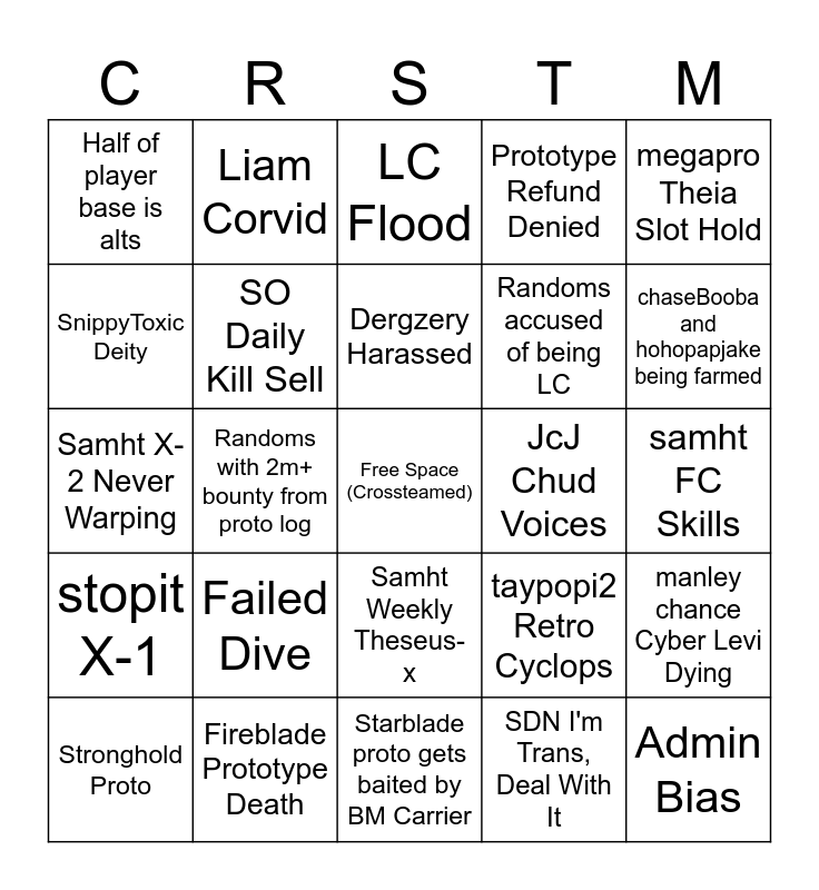 This bingo card has a free space and 24 words: Failed Dive, Fireblade Prototype Death, Dergzery Harassed, Stronghold Proto, megapro Theia Slot Hold, Half of player base is alts, SnippyToxic Deity, Liam Corvid, JcJ Chud Voices, Samht Weekly Theseus-x, Randoms accused of being LC, Samht X-2 Never Warping, taypopi2 Retro Cyclops, manley chance Cyber Levi Dying, SO Daily Kill Sell, SDN I'm Trans, Deal With It, samht FC Skills, LC Flood, chaseBooba and hohopapjake being farmed, Randoms with 2m+ bounty from proto log, Admin Bias, stopit X-1, Prototype Refund Denied and Starblade proto gets baited by BM Carrier.