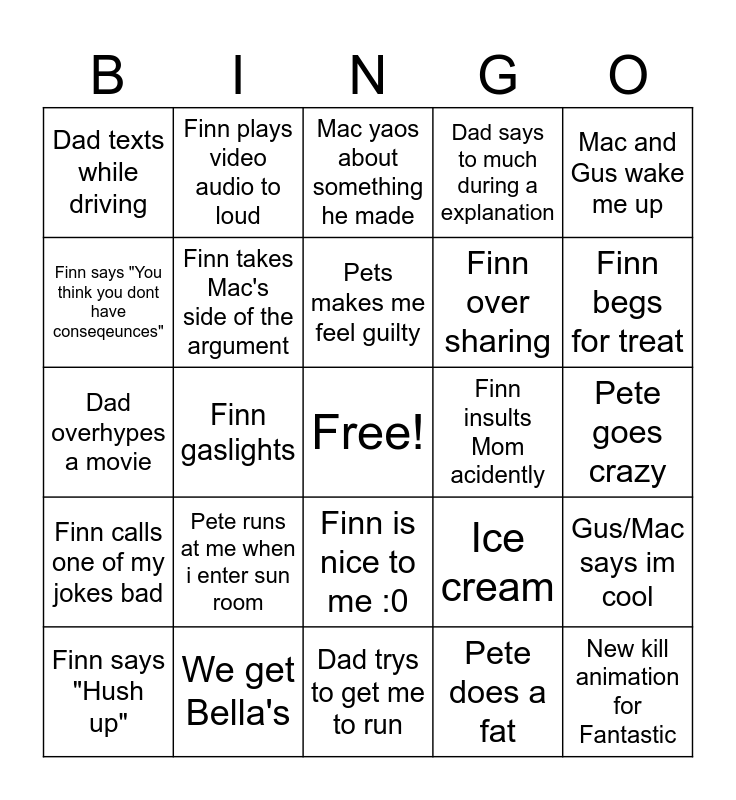 This bingo card has a free space and 29 words: Finn says "Hush up", Mom stays up past 9:10, Finn gaslights, Swim at Mr. Eagans, Dad texts while driving, Mac yaos about something he made, Finn takes Mac's side of the argument, Pete runs at me when i enter sun room, Finn insults Mom acidently, We get Bella's, Pete goes crazy, New kill animation for Fantastic, Dad trys to get me to run, Pete does a fat, Finn begs for treat, We actually buy switch 2, Finn is nice to me :0, Finn calls one of my jokes bad, Mac and Gus wake me up, Dad overhypes a movie, Ice cream, Pete trys to eat my blanket tag, Finn over sharing, Finn says "You think you dont have conseqeunces", Dad says to much during a explanation, Finn plays video audio to loud, Gus/Mac says im cool, Pets makes me feel guilty and Finn/Mac unnecessary commenting.