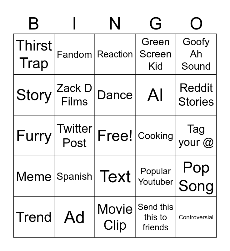 This bingo card has a free space and 24 words: Spanish, Ad, Dance, Trend, Goofy Ah Sound, Thirst Trap, Story, Fandom, Cooking, Text, AI, Furry, Popular Youtuber, Pop Song, Zack D Films, Send this this to friends, Tag your @, Reaction, Reddit Stories, Twitter Post, Controversial, Meme, Green Screen Kid and Movie Clip.