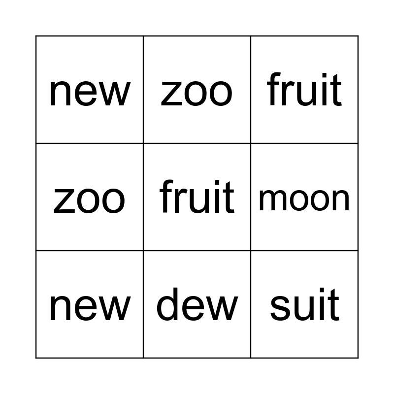 This bingo card has a free space and 23 words: Tuesday, blue, dew, glue, suit, new, moon, zoo, food, clue, boot, Tuesday, blue, dew, glue, clue, fruit, suit, new, moon, zoo, food and boot.