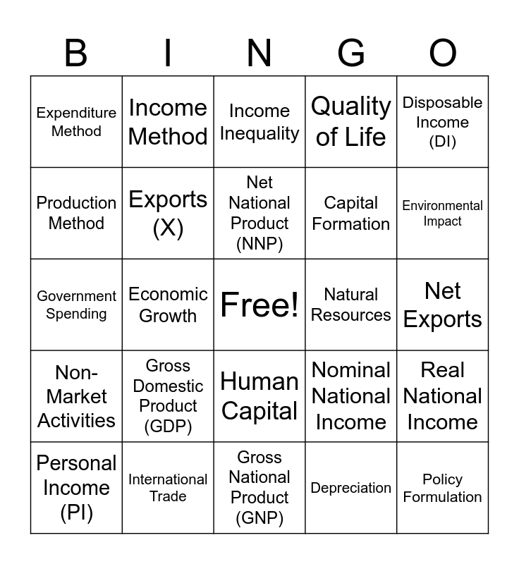 This bingo card has a free space and 25 words: Gross Domestic Product (GDP), Gross National Product (GNP), Net National Product (NNP), Personal Income (PI), Disposable Income (DI), Expenditure Method, Production Method, Income Method, Natural Resources, Human Capital, Capital Formation, Government Spending, Nominal National Income, Real National Income, Exports (X), Imports (M), Net Exports, Income Inequality, Environmental Impact, Economic Growth, Policy Formulation, International Trade, Non-Market Activities, Quality of Life and Depreciation.