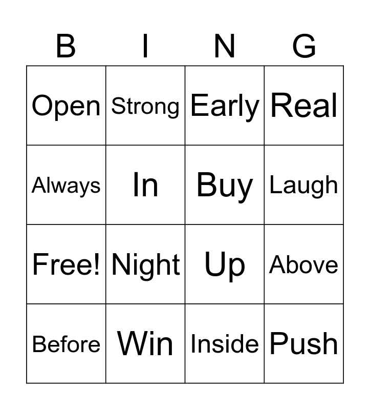 This bingo card has 20 words: Above, Full, Early, Soft, Before, Always, Win, Open, Free!, Strong, Night, Up, In, Push, Buy, Light, Laugh, Real, Inside and Begin.