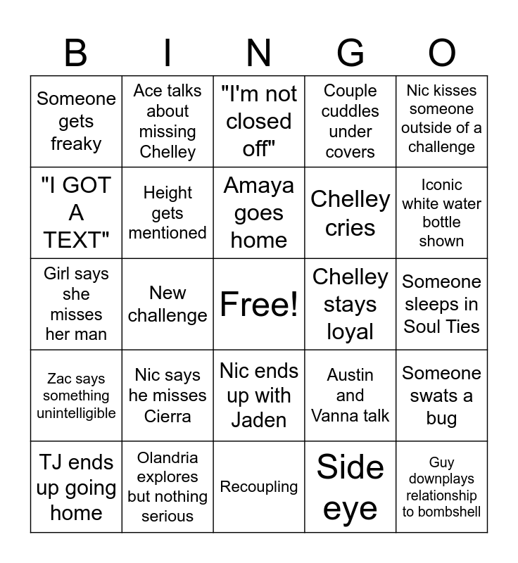 This bingo card has a free space and 24 words: Nic says he misses Cierra, Olandria explores but nothing serious, Amaya goes home, TJ ends up going home, Nic kisses someone outside of a challenge, Someone gets freaky, "I GOT A TEXT", Ace talks about missing Chelley, Chelley stays loyal, Nic ends up with Jaden, Chelley cries, Girl says she misses her man, Austin and Vanna talk, Someone swats a bug, Height gets mentioned, Side eye, Someone sleeps in Soul Ties, "I'm not closed off", Iconic white water bottle shown, New challenge, Guy downplays relationship to bombshell, Zac says something unintelligible, Couple cuddles under covers and Recoupling.