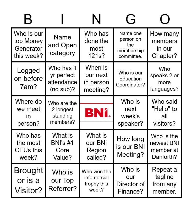 This bingo card has a free space and 24 words: What is BNI's #1 Core Value?, Who is our Top Referrer?, When is our next in person meeting?, Brought or is a Visitor?, How many members in our Chapter?, Who is our top Money Generator this week?, Logged on before 7am?, Name and Open category, Who is next week's speaker?, What is our BNI Region called?, Who is our Education Coordinator?, Where do we meet in person?, How long is our BNI Meeting?, Who is the newest BNI member at Danforth?, Who has 1 yr perfect attendance (no sub)?, Who is our Director of Finance?, Who said "Hello" to all visitors?, Who has done the most 121s?, Who speaks 2 or more languages?, Who are the 2 longest standing members?, Repeat a tagline from any member., Who has the most CEUs this week?, Name one person on the membership committee. and Who won the infomercial trophy this week?.