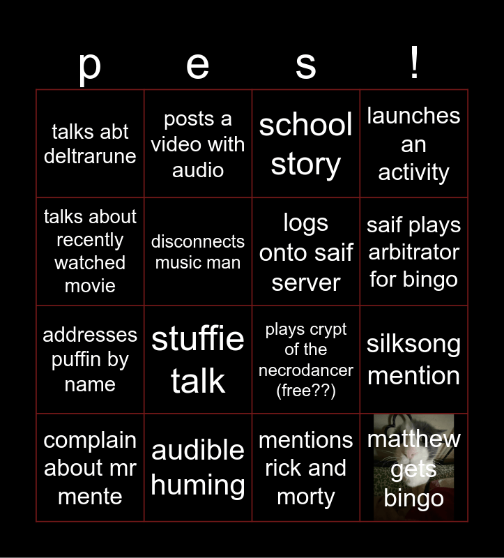 This bingo card has 1 images and 16 words: audible huming, silksong mention, school story, talks abt deltrarune, addresses puffin by name, posts a video with audio, plays crypt of the necrodancer (free??), mentions rick and morty, talks about recently watched movie, disconnects music man, complain about mr mente, launches an activity, stuffie talk, saif plays arbitrator for bingo, logs onto saif server and matthew gets bingo.