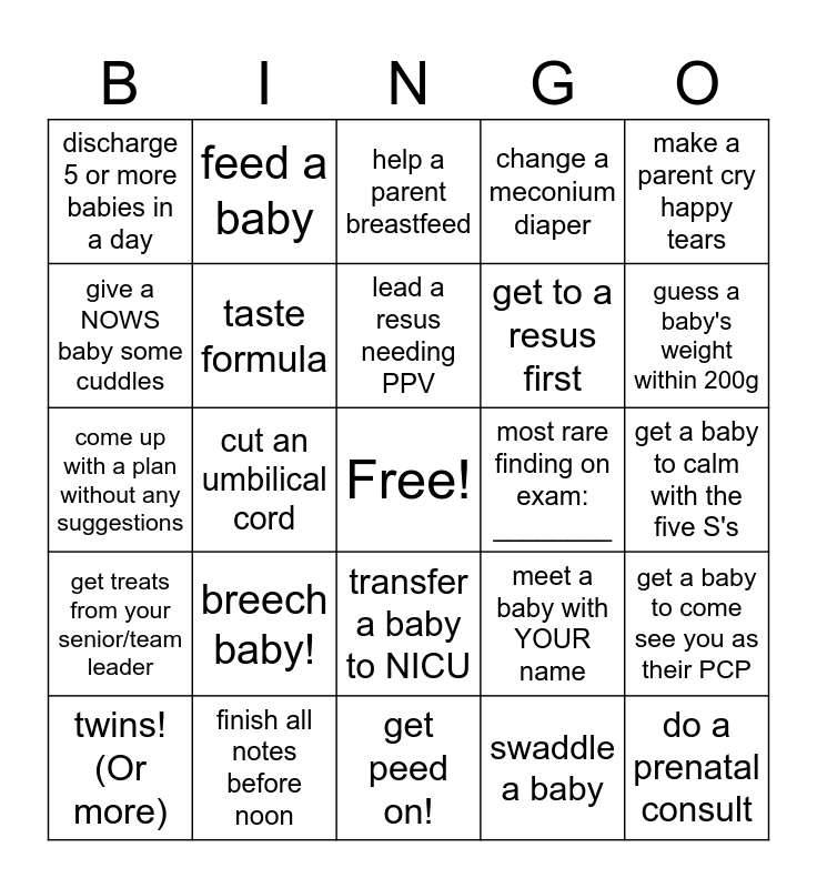 This bingo card has a free space and 24 words: breech baby!, finish all notes before noon, lead a resus needing PPV, twins! (Or more), make a parent cry happy tears, discharge 5 or more babies in a day, give a NOWS baby some cuddles, feed a baby, most rare finding on exam: ________, transfer a baby to NICU, get to a resus first, come up with a plan without any suggestions, meet a baby with YOUR name, get a baby to come see you as their PCP, taste formula, swaddle a baby, get a baby to calm with the five S's, help a parent breastfeed, guess a baby's weight within 200g, cut an umbilical cord, do a prenatal consult, get treats from your senior/team leader, change a meconium diaper and get peed on!.