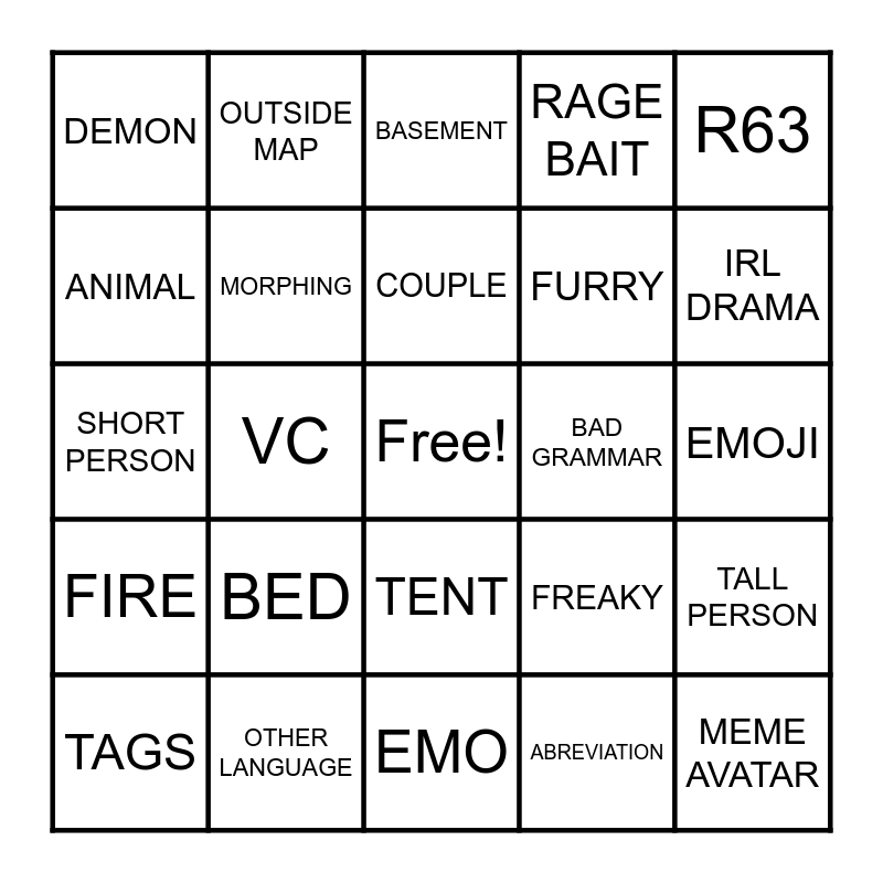 This bingo card has a free space and 27 words: FREAKY, CUDDLE, FURRY, EMO, ANIMAL, BASEMENT, OUTSIDE MAP, FIRE, BAD GRAMMAR, TALL PERSON, SHORT PERSON, RAGE BAIT, TAGS, OTHER LANGUAGE, IRL DRAMA, SIMP, MORPHING, COUPLE, BED, DEMON, EMOJI, ABREVIATION, VC, MEME AVATAR, TENT, R63 and GANG.