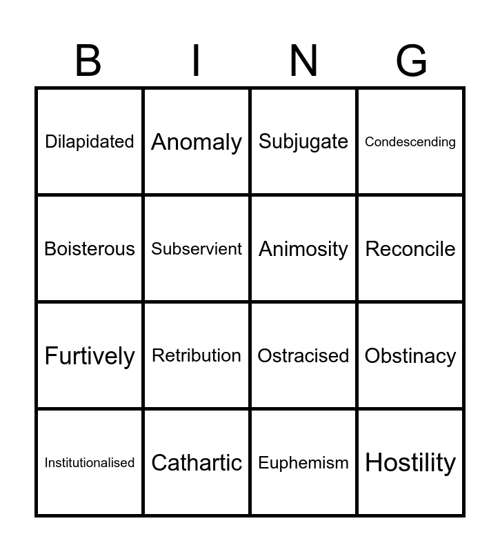This bingo card has 16 words: Cathartic, Obstinacy, Subjugate, Dilapidated, Furtively, Anomaly, Ostracised, Euphemism, Boisterous, Subservient, Institutionalised, Condescending, Retribution, Reconcile, Animosity and Hostility.