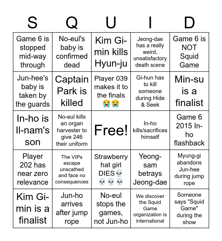 This bingo card has a free space and 24 words: The VIPs escape unscathed and face no consequences, Jun-ho arrives after jump rope, Player 039 makes it to the finals๐ญ๐ญ, Kim Gi-min is a finalist, Game 6 is NOT Squid Game, Game 6 is stopped mid-way through, Jun-hee's baby is taken by the guards, No-eul's baby is confirmed dead, In-ho kills/sacrifices himself, Strawberry hat girl DIES๐๐๐๐, Gi-hun has to kill someone during Hide & Seek, In-ho is Il-nam's son, Yeong-sam betrays Jeong-dae, Myung-gi abandons Jun-hee during jump rope, Captain Park is killed, We discover the Squid Game organization is international, Game 6 2015 In-ho flashback, Kim Gi-min kills Hyun-ju, Min-su is a finalist, No-eul kills an organ harvester to give 246 their uniform, Someone says "Squid Game" during the show, Player 202 has near zero relevance, Jeong-dae has a really weird, unsatisfactory death scene and No-eul stops the games, not Jun-ho.