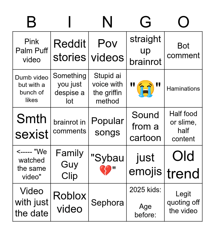 This bingo card has a free space and 24 words: Family Guy Clip, Roblox video, Stupid ai voice with the griffin method, Video with just the date, Bot comment, Pink Palm Puff video, Dumb video but with a bunch of likes, Reddit stories, Sound from a cartoon, "Sybau 💔", "ðŸ˜", Smth sexist, just emojis, Old trend, Something you just despise a lot, 2025 kids: Age before:, Half food or slime, half content, Pov videos, Haminations, brainrot in comments, Legit quoting off the video, <----- "We watched the same video", straight up brainrot and Sephora.