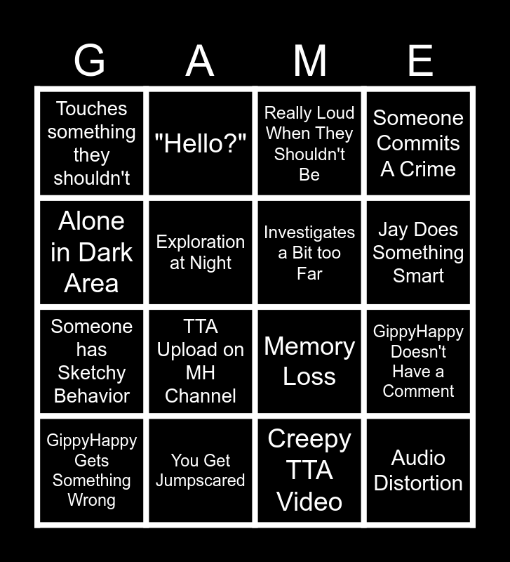 This bingo card has 21 words: You Get Jumpscared, Jay does something stupid, "Hello?", Abundance of Coughing, Creepy TTA Video, Investigates a Bit too Far, Touches something they shouldn't, Really Loud When They Shouldn't Be, Memory Loss, Jay Does Something Smart, Someone has Sketchy Behavior, Someone Commits A Crime, Audio Distortion, Camera/Visual Glitches, Exploration at Night, Basement at Night, GippyHappy Gets Something Wrong, TTA Upload on MH Channel, Alone in Dark Area, GippyHappy Doesn't Have a Comment and You Laugh at Any Point in the Season (At Anything).