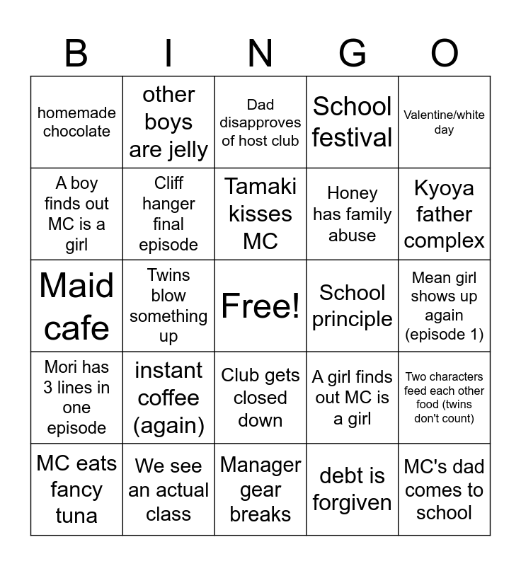 This bingo card has a free space and 24 words: instant coffee (again), We see an actual class, Tamaki kisses MC, MC eats fancy tuna, Valentine/white day, homemade chocolate, A boy finds out MC is a girl, other boys are jelly, School principle, Club gets closed down, Honey has family abuse, Maid cafe, A girl finds out MC is a girl, Two characters feed each other food (twins don't count), Cliff hanger final episode, debt is forgiven, Mean girl shows up again (episode 1), Dad disapproves of host club, Kyoya father complex, Twins blow something up, MC's dad comes to school, Mori has 3 lines in one episode, School festival and Manager gear breaks.