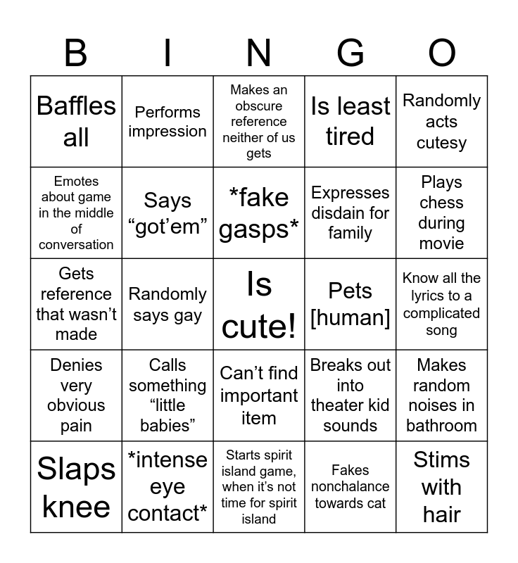 This bingo card has a free space and 24 words: Calls something “little babies”, *intense eye contact*, *fake gasps*, Slaps knee, Randomly acts cutesy, Baffles all, Emotes about game in the middle of conversation, Performs impression, Pets [human], Can’t find important item, Expresses disdain for family, Gets reference that wasn’t made, Breaks out into theater kid sounds, Makes random noises in bathroom, Says “got’em”, Fakes nonchalance towards cat, Know all the lyrics to a complicated song, Makes an obscure reference neither of us gets, Plays chess during movie, Randomly says gay, Stims with hair, Denies very obvious pain, Is least tired and Starts spirit island game, when it’s not time for spirit island.