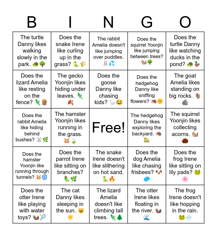 This bingo card has a free space and 30 words: The cat Danny likes sleeping in the sun. πΊβοΈ, The dog Amelia doesn't like swimming in the lake. πΆπ, The hamster Yoonjin likes running in the grass. πΉπ, The parrot Irene doesn't like flying in the wind. π¦π¨, The turtle Danny likes walking slowly in the park. π’π³, The rabbit Amelia doesn't like jumping over puddles. π°π¦, The gecko Yoonjin likes hiding under leaves. π¦π, The snake Irene doesn't like slithering on hot sand. ππ₯, The hedgehog Danny likes exploring the backyard. π¦π‘, The lizard Amelia doesn't like climbing tall trees. π¦π², The squirrel Yoonjin likes collecting acorns. πΏοΈπ°, The frog Irene doesn't like hopping in the rain. πΈπ§οΈ, The otter Irene likes floating in the river. π¦¦π, The goose Danny doesn't like waddling too far. π¦’π, The goat Amelia likes standing on big rocks. ππͺ¨, Does the cat Danny like climbing trees? π±π³, Does the dog Amelia like chasing frisbees? πΆπ₯, Does the hamster Yoonjin like running through tunnels? πΉπ, Does the parrot Irene like sitting on branches? π¦πΏ, Does the turtle Danny like watching ducks in the pond? π’π¦, Does the rabbit Amelia like hiding behind bushes? π°πΏ, Does the gecko Yoonjin like sunbathing on a rock? π¦βοΈ, Does the snake Irene like curling up in the grass? ππΎ, Does the hedgehog Danny like sniffing flowers? π¦πΌ, Does the lizard Amelia like resting on the fence? π¦πͺ΅, Does the squirrel Yoonjin like jumping between trees? πΏοΈπ³, Does the frog Irene like sitting on lily pads? πΈπΈ, Does the otter Irene like playing with water toys? π¦¦πΎ, Does the goose Danny like chasing kids? π¦’π and Does the goat Amelia like racing with friends? ππββοΈ.