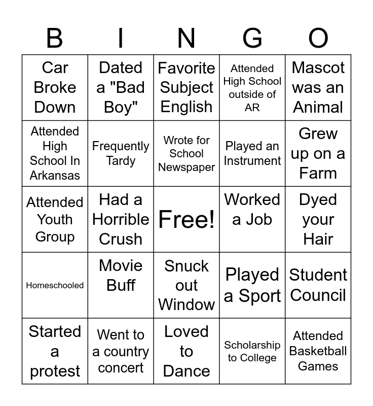 This bingo card has a free space and 24 words: Movie Buff, Went to a country concert, Wrote for School Newspaper, Started a protest, Mascot was an Animal, Car Broke Down, Attended High School In Arkansas, Dated a "Bad Boy", Worked a Job, Snuck out Window, Played an Instrument, Attended Youth Group, Played a Sport, Student Council, Frequently Tardy, Scholarship to College, Dyed your Hair, Favorite Subject English, Grew up on a Farm, Had a Horrible Crush, Attended Basketball Games, Homeschooled, Attended High School outside of AR and Loved to Dance.