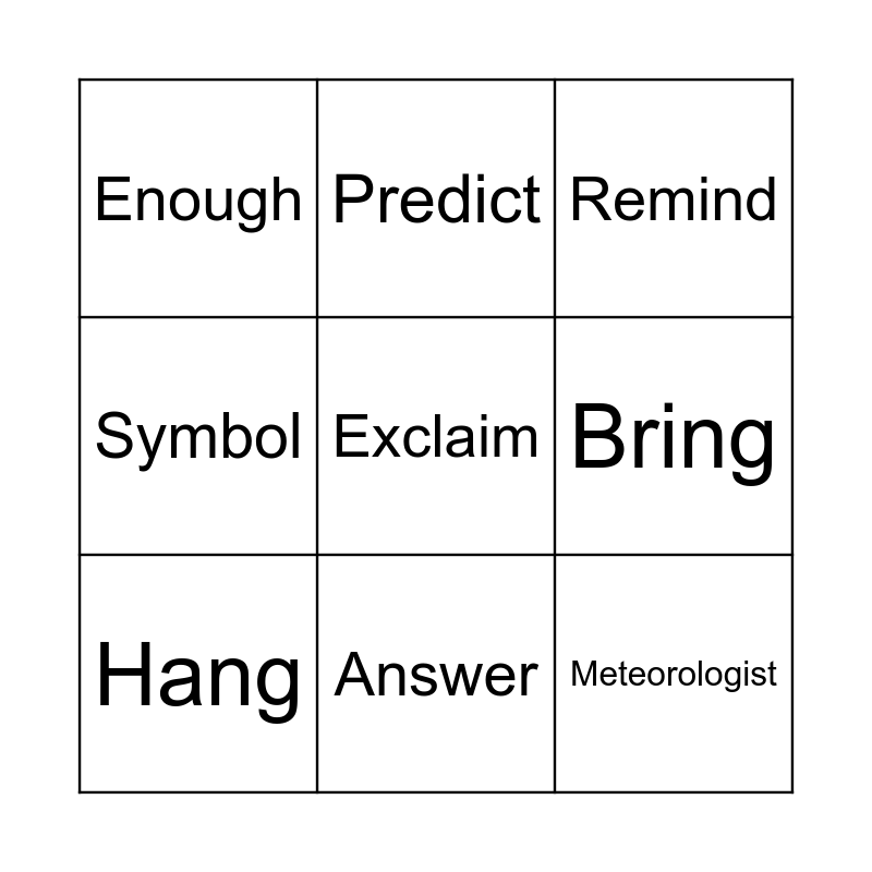 This bingo card has a free space and 8 words: Bring, Remind, Predict, Hang, Enough, Meteorologist, Symbol and Answer.