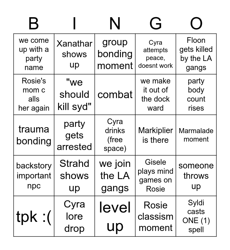 This bingo card has a free space and 24 words: Strahd shows up, Cyra lore drop, combat, tpk :(, Floon gets killed by the LA gangs, we come up with a party name, Rosie's mom calls her again, Xanathar shows up, Markiplier is there, we join the LA gangs, we make it out of the dock ward, trauma bonding, Gisele plays mind games on Rosie, someone throws up, "we should kill syd", Rosie classism moment, Marmalade moment, group bonding moment, party body count rises, party gets arrested, Syldi casts ONE (1) spell, backstory important npc, Cyra attempts peace, doesnt work and level up.