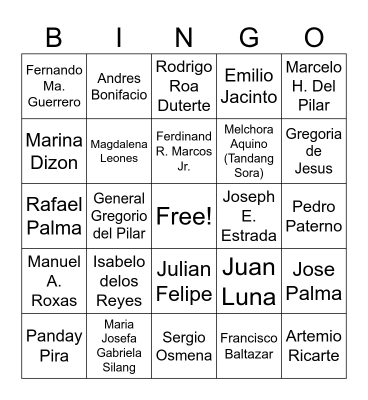 This bingo card has a free space and 72 words: Dr. Jose Rizal, Andres Bonifacio, General Gregorio del Pilar, General Emilio Aguinaldo, Apolinario Mabini, GOMBURZA, Emilio Jacinto, General Antonio Luna, Melchora Aquino (Tandang Sora), Graciano Lopez-Jaena, Panday Pira, Mariano Ponce, Gregoria de Jesus, Fernando Ma. Guerrero, Felipe Agoncillo, Rafael Palma, Juan Luna, Marcelo H. Del Pilar, Leona Florentino, Pedro Paterno, Isabelo delos Reyes, Artemio Ricarte, Jose Palma, Lakandula, Rajah Soliman, Leonor Rivera, Marcela Agoncillo, Galicano Apacible, Jose Ma. Panganiban, Diego Silang, Maria Josefa Gabriela Silang, Lapu-Lapu, Francisco Dagohoy, Epifanio delos Santos, Francisco Baltazar, Teresa Magbanua, Trinidad Tecson, Agueda Esteban, Marina Dizon, General Francisco Makabulos, Julian Felipe, Emilio Aguinaldo, Manuel L. Quezon, Jose P. Laurel, Sergio Osmeña Sr., Manuel A. Roxas, Elpidio R. Quirino, Ramon Magsaysay Sr., Carlos P. Garcia, Diosdado P. Macapagal, Ferdinand E. Marcos, Corazon C. Aquino, Fidel V. Ramos, Joseph E. Estrada, Gloria Macapagal Arroyo, Benigno Aquino III, Rodrigo Roa Duterte, Ferdinand R. Marcos Jr., Macario Sakay, Pedro Paterno, Luis Taruc, Ninoy Aquino, Raul Manglapus, Sergio Osmena, Captain Jose Cabalfin Calugas, Cesar Fernando Basa, Magdalena Leones, Valeria Panlilio, Carmen Rosales, Josefa Capistrano, Maria Ylagan Orosa and Josefa Escoda.