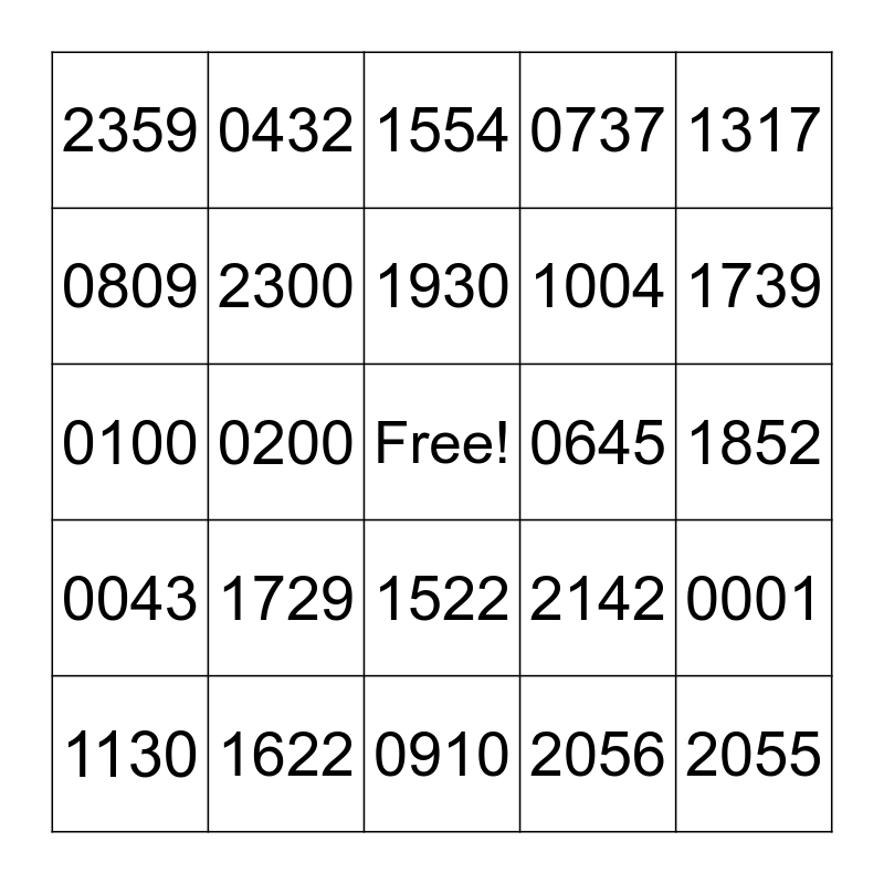 This bingo card has a free space and 24 words: 1130, 1729, 1930, 2056, 1317, 2359, 0432, 1554, 0645, 1852, 0100, 2300, 2142, 0001, 0809, 1622, 0910, 0737, 1739, 0043, 0200, 1522, 1004 and 2055.