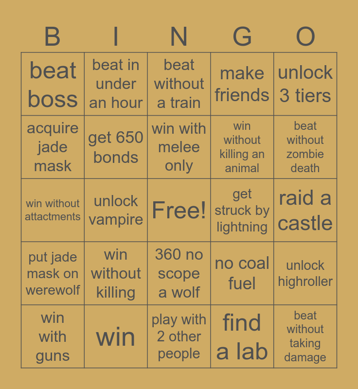 This bingo card has a free space and 24 words: win without killing, win, win with melee only, win with guns, unlock 3 tiers, beat boss, acquire jade mask, beat in under an hour, get struck by lightning, 360 no scope a wolf, win without killing an animal, win without attactments, no coal fuel, unlock highroller, get 650 bonds, find a lab, raid a castle, beat without a train, beat without zombie death, unlock vampire, beat without taking damage, put jade mask on werewolf, make friends and play with 2 other people.