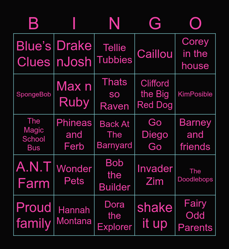 This bingo card has a free space and 25 words: Wonder Pets, Dora the Explorer, Thats so Raven, Proud family, Corey in the house, Blue’s Clues, SpongeBob, Drake nJosh, Go Diego Go, Bob the Builder, Clifford the Big Red Dog, The Magic School Bus, Invader Zim, The Doodlebops, Max n Ruby, Rugrats, Barney and friends, Tellie Tubbies, KimPosible, Phineas and Ferb, Fairy Odd Parents, Hannah Montana, A.N.T Farm, Caillou and shake it up.