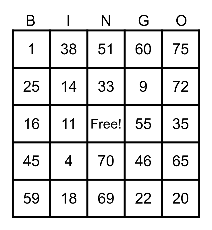 This bingo card has a free space and 24 words: 4, 18, 33, 59, 75, 1, 25, 38, 55, 70, 9, 16, 46, 65, 14, 22, 35, 51, 72, 11, 20, 45, 60 and 69.