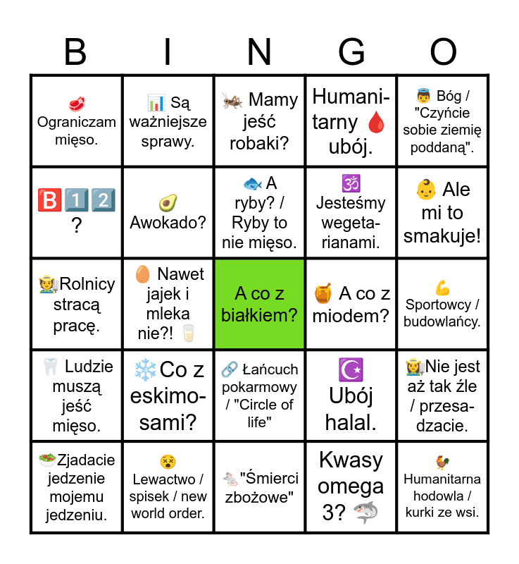 This bingo card has a free space and 39 words: 🌿 Rośliny też czują, 🦁 Powiedzcie to lwom (drapieżniki), 🧪 W jedzeniu jest chemia / Co z GMO?, 🥑Awokado?, 🥗Zjadacie jedzenie mojemu jedzeniu., 🔗 Łańcuch pokarmowy / "Circle of life", 🐟 A ryby? / Ryby to nie mięso., ⛓️Zwierzęta po to istnieją., 👼 Bóg / "Czyńcie sobie ziemię poddaną"., 🦷 Ludzie muszą jeść mięso., 🥚 Nawet jajek i mleka nie?! 🥛, Humani-tarny 🩸 ubój., 🐓Humanitarna hodowla / kurki ze wsi., 💪 Sportowcy / budowlańcy., 🍯 A co z miodem?, ❄️Co z eskimo-sami?, 🌴A gdybyś był na bezludnej wyspie?, 🥩Ograniczam mięso., ✅ To mój wybór., ☪️ Ubój halal., 🅱️1️⃣2️⃣ ?, 🐁"Śmierci zbożowe", 🕉️ Jesteśmy wegeta- rianami., 👶 Ale mi to smakuje!, 👤 Co ja mogę sam?, ⚖️ To zgodne z prawem!, 📅 Dawniej było lepiej., 🐄 Krowy wyginą jeśli nie będzie się ich hodować., 🚫Aborcja., 📊 Są ważniejsze sprawy., 💲 Weganizm jest drogi., 💸 Kto wam za to płaci?, 🦗 Mamy jeść robaki?, 😵 Lewactwo / spisek / new world order., Kwasy omega 3? 🦈, 💵 Nie można żyć w pełni etycznie (kapitalizm)., 👩🌾Nie jest aż tak źle / przesa-dzacie., 🧑🌾Rolnicy stracą pracę. and 🌍 Świata się nie zmieni (nigdy wam się nie uda)!.