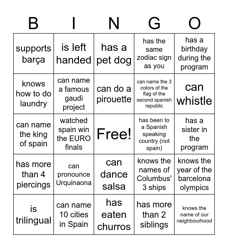 This bingo card has a free space and 24 words: can pronounce Urquinaona, can name 10 cities in Spain, can do a pirouette, is trilingual, has a birthday during the program, supports barça, knows how to do laundry, is left handed, has been to a Spanish speaking country (not spain), can dance salsa, can name the 3 colors of the flag of the second spanish republic, can name the king of spain, knows the names of Columbus' 3 ships, knows the year of the barcelona olympics, can name a famous gaudi project, has more than 2 siblings, has a sister in the program, has a pet dog, can whistle, watched spain win the EURO finals, knows the name of our neighbourhood, has more than 4 piercings, has the same zodiac sign as you and has eaten churros.