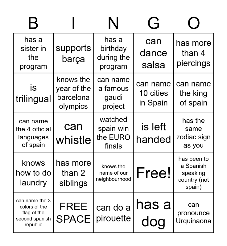 This bingo card has 27 words: Free!, can pronounce Urquinaona, can name 10 cities in Spain, can do a pirouette, is trilingual, has a birthday during the program, supports barça, knows how to do laundry, is left handed, has been to a Spanish speaking country (not spain), can name the 4 official languages of spain, can dance salsa, can name the 3 colors of the flag of the second spanish republic, FREE SPACE, can name the king of spain, knows the names of Columbus' 3 ships, knows the year of the barcelona olympics, can name a famous gaudi project, has more than 2 siblings, has a sister in the program, has the same zodiac sign as you, has a dog, can whistle, watched spain win the EURO finals, knows the name of our neighbourhood, has more than 4 piercings and has tried churros.