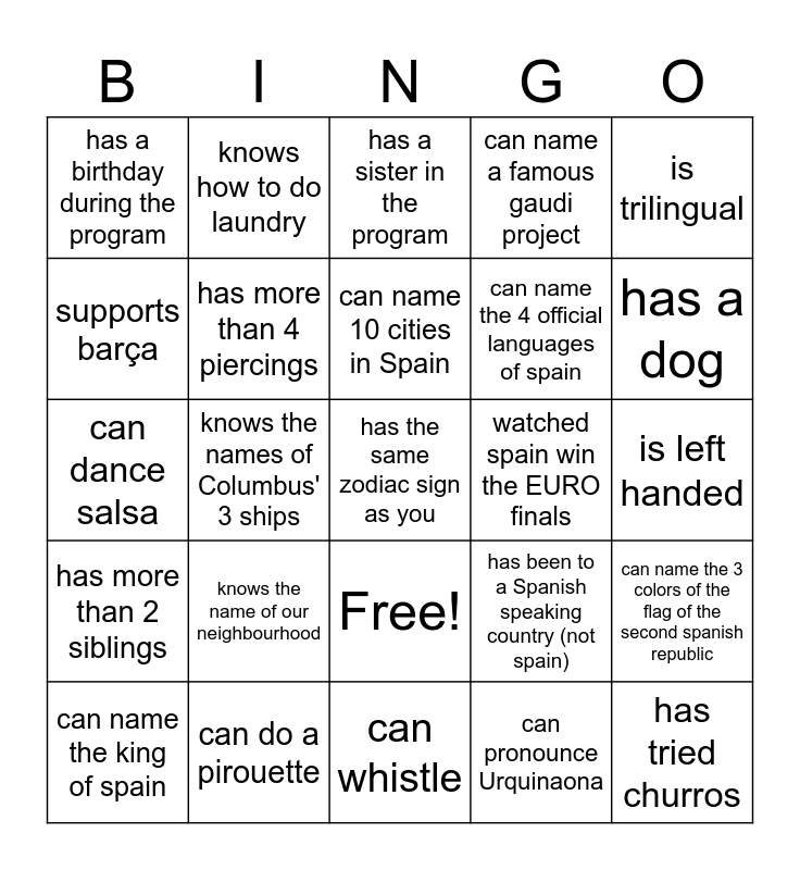 This bingo card has 26 words: Free!, can pronounce Urquinaona, can name 10 cities in Spain, can do a pirouette, is trilingual, has a birthday during the program, supports barça, knows how to do laundry, is left handed, has been to a Spanish speaking country (not spain), can name the 4 official languages of spain, can dance salsa, can name the 3 colors of the flag of the second spanish republic, can name the king of spain, knows the names of Columbus' 3 ships, knows the year of the barcelona olympics, can name a famous gaudi project, has more than 2 siblings, has a sister in the program, has the same zodiac sign as you, has a dog, can whistle, watched spain win the EURO finals, knows the name of our neighbourhood, has more than 4 piercings and has tried churros.